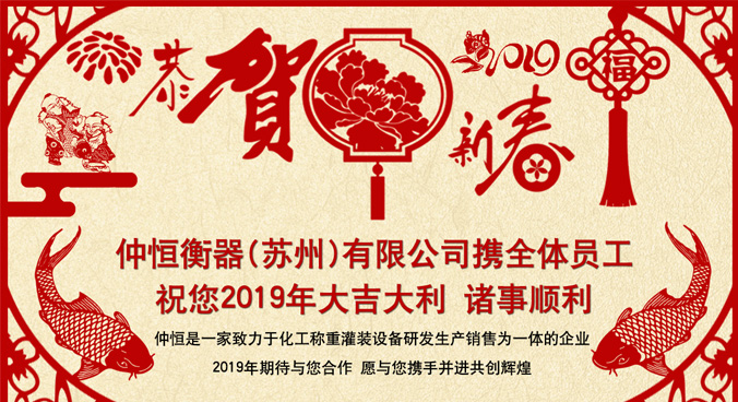 仲恒衡器(蘇州)有限公司攜全體員工祝您2019年大吉大利諸事順利,仲恒是一家致力于化工稱重灌裝設(shè)備研發(fā)生產(chǎn)銷售為一體的企業(yè),2019年期待與您合作,愿與您攜手并進(jìn)共創(chuàng)輝...